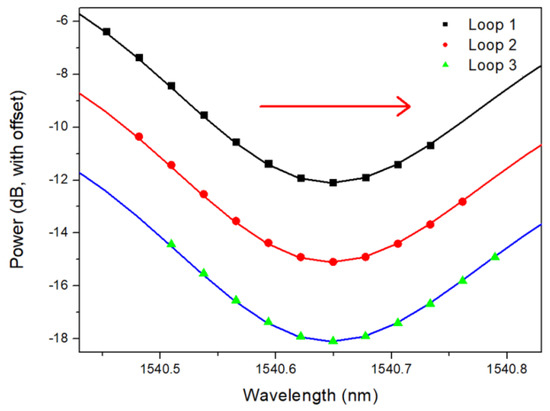 The peak identification was conducted in the wavelength range from 1539.5 nm to 1566 nm with a wavelength resolution of 0.028 nm, including 20 cladding mode resonances adjacent to the SPR signature. Due to the small refractive index change, the SPR signature almost remained during this experiment. Driven by the wish to calibrate this sensor probe automatically, first of all, the peak detection was conducted by comparing transmitted power of 11 continuous wavelength sampling points from 1539.5 nm, which looped to 1566 nm in turn [20,21,22,23]. The amount 11 of the wavelengths in one sequence is optimized to better filter out the spectral noise. Figure 4 presents an example of three loops around the peak ~1540.6 nm. If the power of the 6th wavelength in the middle of this sequence is the maximum or the minimum, the 6th wavelength is regarded as the peak, so-called max-peak or min-peak. Therefore, the 6th wavelength in loop 3 is regarded as the central wavelength of the min-peak (cladding mode resonance). Using the same methodology, each peak was issued a serial number in order, as shown in Figure 5.