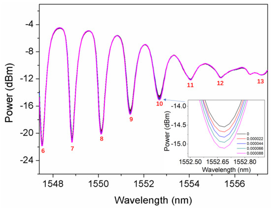 To avoid the downside, only the linear regressions for the cladding modes (No. 7–No. 10) with higher than 99% showing good linearity were considered. After comparison, the most sensitive cladding mode No. 10 with a sensitivity of −6887 dB/RIU was obtained, whose spectral variation is presented in the inset of Figure 6. On the contrary, the linear regressions for cladding modes No. 11 and No. 12 with lower , which are 95.5% and 98.5%, respectively, were abandoned. Meanwhile, they present the lowest sensitivities of −1899 dB/RIU and −1840 dB/RIU, respectively.