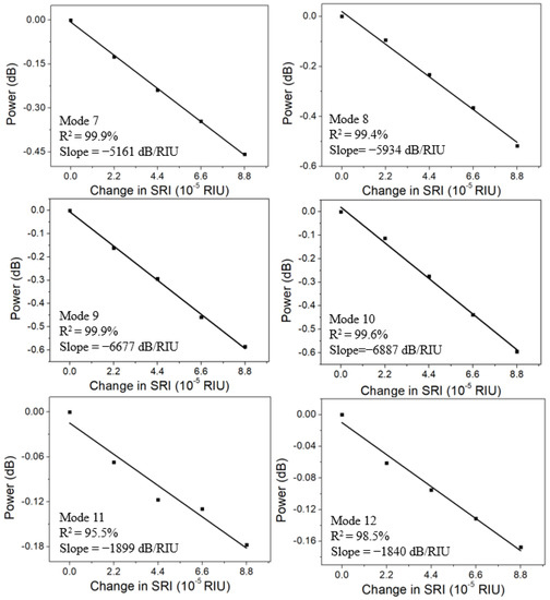 Linear regressions of the amplitudes of the cladding modes No. 7–No. 12 in different glucose aqueous solutions (refractive index ~1.3573) with a SRI change of 8.8 × 10−5.