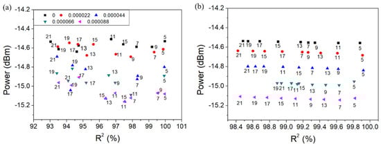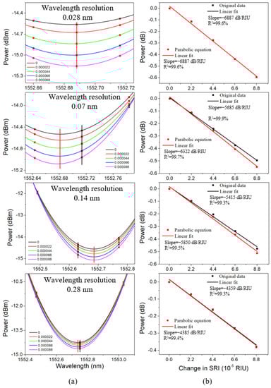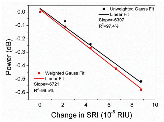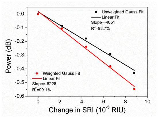 For the wavelength resolution 0.07 nm, the sensitivities obtained by unweighted and weighted Gauss fitting are −6307 dB/RIU and −6721 dB/RIU, respectively, as shown in Figure 11, which are higher than the sensitivity resulting from the original data −5685 dB/RIU. Additionally, the sensitivity calculated from unweighted Gauss fitting is close to −6332 dB/RIU resulting from the parabolic equation, and the linear fit corresponding to unweighted Gauss fitting is only 97.4%, which is inappropriate for sensing applications. Compared to unweighted Gauss fitting, the sensitivity obtained by weighted Gauss fitting is improved by 6.6%, and the linear fit is 99.5%. Both the sensitivity and the are similar to the results obtained from original data or parabolic equation for the wavelength resolution 0.028 nm.