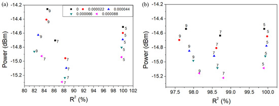 Figure 6 shows the spectra adjacent to the SPR signature in different glucose aqueous solutions (refractive index ~1.3573) with a SRI change of 8.8 × 10−5. Due to small refractive index variation, only amplitudes of the cladding modes were investigated. The linear regressions of the amplitudes of the sensitive cladding modes (No. 7–No. 12) are demonstrated in Figure 7. The linear regression equation [24,25] is validated to build the relationship between the independent variables (SRI) and the dependent variables (amplitude) for the prediction of SRI according to the amplitude of the cladding mode. It is of great importance that the factor of [26] is used to evaluate whether both independent and dependent variables in the regression equation are a good fit, defined by
