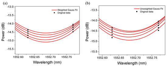 Afterwards, odd number over three of original data centered on the cladding mode were considered for Gauss fitting. In addition, since the data centered on the min-peak of the cladding modes play more important roles for Gauss fitting, the weighting rule that data closer to the min-peak have greater weight, and vice versa, is applied for Gauss fitting improvement. Weighted fitting has been applied successfully in industry and pharmacy in previous works [27,28,29]. The specific weight formula is as follows: