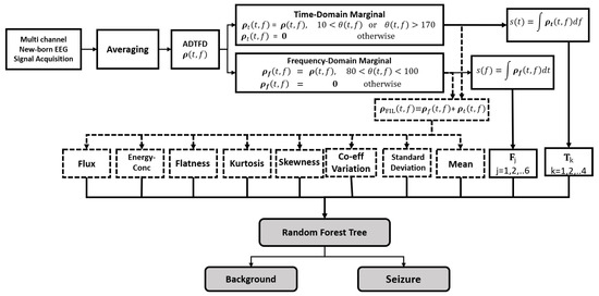 Timely detection of seizures in newborns can help to save lives [1]. Clinical signs of seizures in newborns are difficult to observe, so, in this study, we propose an automated method of detecting seizures in newborns using multi-channel electroencephalogram (EEG) recording. Seizure detection usually requires monitoring of electroencephalogram (EEG) signals by an expert neurophysiologist. So, there is a need to develop an automated seizure detection algorithm. Machine learning based seizure detection algorithms usually involve the extraction of features from signal representation followed by training of a classifier signal [2,3]. The performance of such methods mainly depends on the discriminatory performance of extracted features. For feature extraction, the following forms of signal representations can be used: (a) time-domain, (b) frequency-domain, and (c) joint time-frequency (TF) domain [4,5,6,7,8]. It has been demonstrated in earlier studies that extracting features from TF features generally leads to better performance than time-domain features or frequency domain features [9,10]. One alternative to extracting features from joint TF representations is to first employ signal decomposition methods such as empirical mode decomposition to decompose signals into their components and then extract features from each component separately [1,11,12].