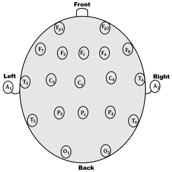 We have used a multi-channel newborn EEG database that is described in [4,29,30] and was made publicly available along with relevant codes at https://github.com/ElsevierSoftwareX/SOFTX-D-17-00059 (accessed on 1 November 2019). The database was acquired from 36 newborns using a 10–20 international electrode placement system at sampling frequency of 256 Hz. The marking of the channels is illustrated in Figure 5, which shows the possible placements of the electrodes. For each location, the first letter identifies the lobe whereas the second number or letter identifies the hemisphere location. The letters F, T, C, P, and O stand for Frontal, Temporal, Central, Parietal, and Occipital. The right hemisphere is represented by even numbers whereas odd numbers represent the left hemisphere. The z refers to an electrode placed on the mid-line. The signals were acquired at Royal Women’s Hospital Brisbane by an expert pediatric neurologist. The database was annotated for seizure, artifacts, and normal background patterns. Ethical approval was given by Royal Brisbane and Women’s Hospital (RBWH), Medical Research Ethics Committee (MREC), Brisbane, Australia [31]. The durations of background, seizures, and artifacts are 6 h, 5.16 h, and 5.04 h, respectively. EEG signals are segmented into non-overlapping segments of 8 s. The recorded dataset was divided into non-overlapping segments of duration 8-s. This database contains a total of 7290 segments including 2332 segments of seizures.