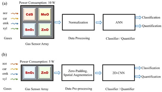 IoT systems designed to detect/measure hazardous gases are found more effective in ubiquitous real-time monitoring of the indoor and outdoor ambiances for people’s safety [14]. Real-time monitoring of the presence of toxic and hazardous gases, especially in industrial ambiance, is of serious concern for the safety and welfare of the workers [15,16,17,18]. The use of non-selective metal oxide semiconductor (MOX)-based gas sensor elements typically make the sensor node cheaper yet power-hungry. Reducing the number of physical gas sensors used in forming the gas sensor array can surely help in reducing the gas sensor node’s power requirements. However, such reduction is possible only when any such reduction in the number of sensor elements does not produce a significant deviation in the performance of the sensor node itself. With the introduction of Artificial Intelligence (AI)-based “computation on the edge” and data pre-processing-based analysis spaces, certain power saving can be expected [19]. Convolutional Neural Networks (CNNs) have been found very effective for such edge computing [20].