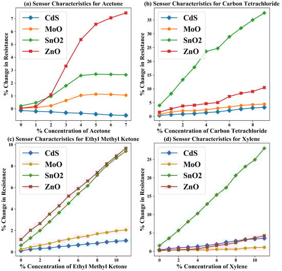 Percent change in resistance of sensor element vs. percent concentration of considered gas characteristics of four elements gas sensor array for four hazardous gases, viz., acetone, carbon tetrachloride, ethyl methyl ketone, and xylene [27].
