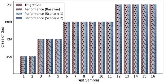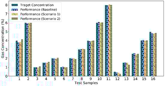 We achieve 100 percent classification accuracy, not only in the best performing case, but also in all the possible cases for this scenario. Hence, with three physical and one zero-padded virtual sensor element, we have achieved 100% accurate classification. For quantification, the MSE occurs 5.82 × 10−3 in the best performing case, while the maximum and minimum errors achieved 3.25 × 10−2 and 2.93 × 10−5, as shown in Figure 5. With one sensor element removal, we have reduced the power consumption of the gas sensor array by 25% and achieved a similarly high-performance classification and quantification to 16 unknown test samples, not used during the training of the CNN.
