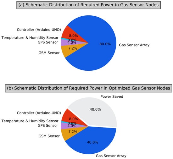 Schematic distribution of required power in gas sensor node; without optimization (a); with optimization carried out by our proposed approach (b).