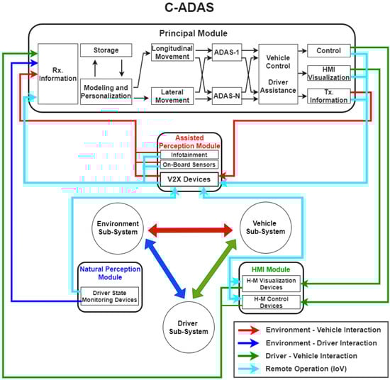 In this section, we describe our C-ADAS architecture proposal from a holistic and systemic vision. The systemic vision considers the relevance of the three main elements that make up the RSS (driver, environment, and vehicle). For its part, the holistic vision also reflects the relevance of considering the dependence and interrelationship that exists between each of these elements as essential requirements for the functioning of the system as a whole. Additionally, we establish a comparative analysis between this proposal and the architectures proposed in the previous reviews, describing its main characteristics and limitations. Figure 2 presents our C-ADAS architecture proposal.