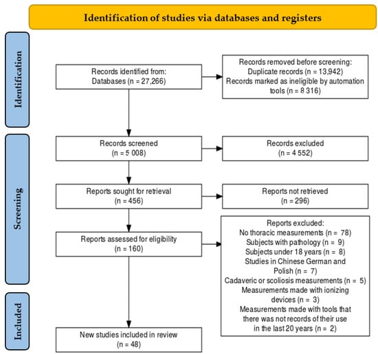 The electronic search saved a total of 27,266 publications in the databases mentioned (Figure 1). Following the selected criteria, title and abstract screening, and the removal of the duplicates in the four databases, 27,106 papers were excluded. The remaining 160 full-text papers were screened for eligibility and 112 were excluded. Among these, 78 had missing thoracic measurements, 9 had subjects with pathology, 8 had subjects aged under 18 years, 7 studies were in Chinese, German, or Polish, 5 papers had cadaveric or scoliosis measurements, 3 publications had measurements made with ionizing devices and 2 studies had measurements made with tools that there were not records of their use in the last 20 years. Finally, 48 studies were included in the review; all had scores higher than 7.5 over 10 on the PEDro and MINORs methodological rating scales (Appendix B and Appendix C). These studies were performed in Europe (17), Oceania (11), Asia (11), and Americas (9). Among these, 48 studies were considered in the meta-analysis.