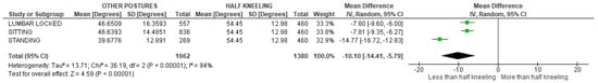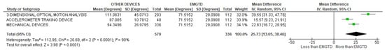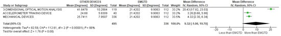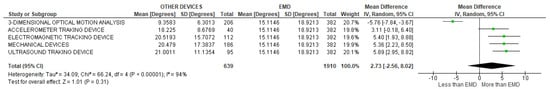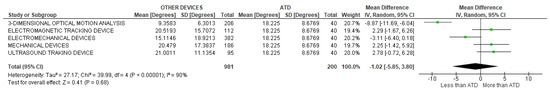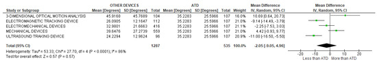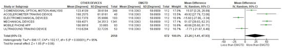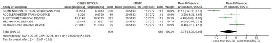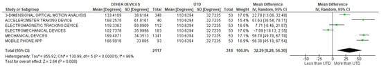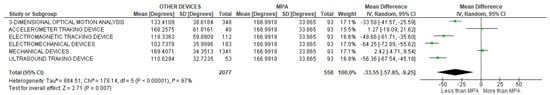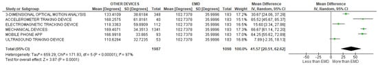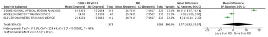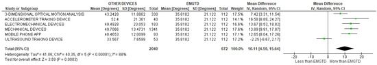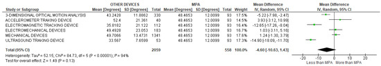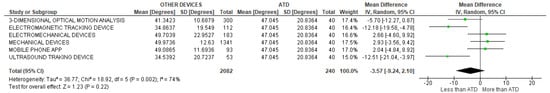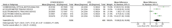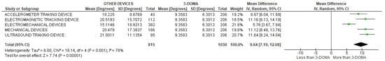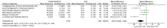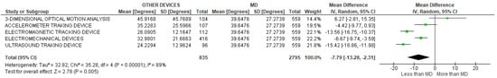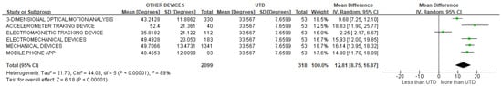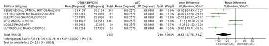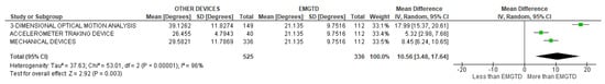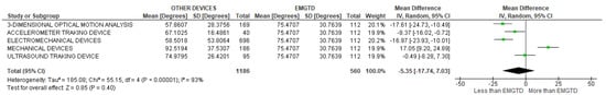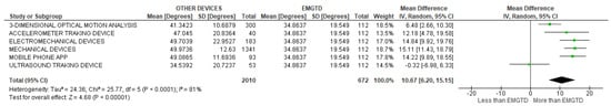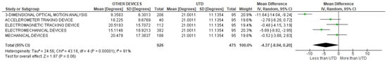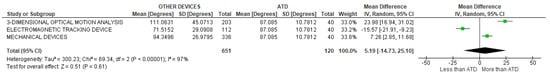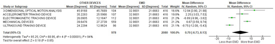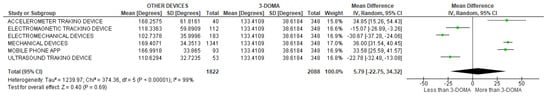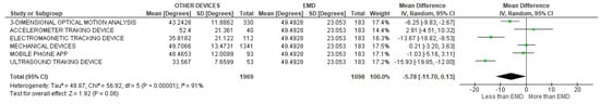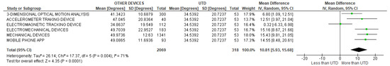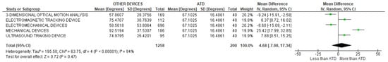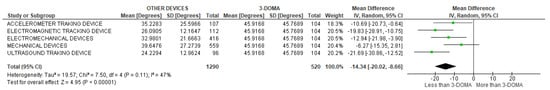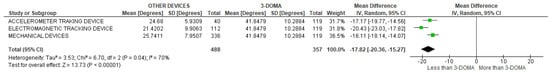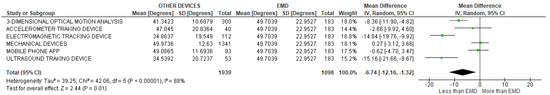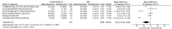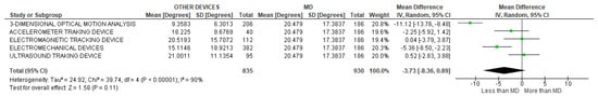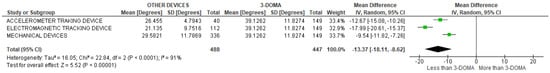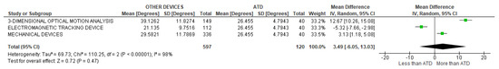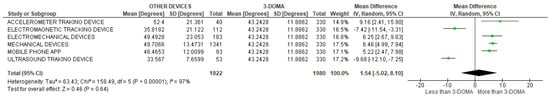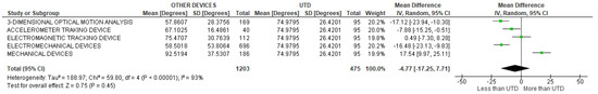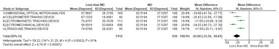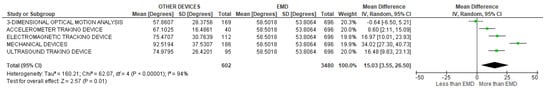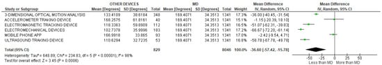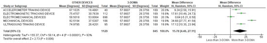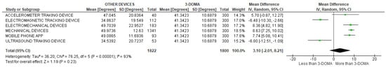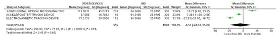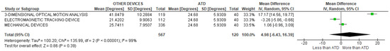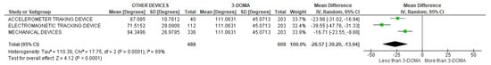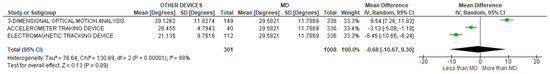 The mean values and 95% confidence interval (CI) range of Flexo-Extension (rFE), range of Flexion (rF), range of Extension (rE), range of Side to Side Lateral Flexion (rSSLF), range of Right Lateral Flexion (rRLF), range of Left Lateral Flexion (rLLF), range of Side to Side Rotation (rSSR), range of Right Rotation (rRR) and range of Left Rotation (rLR) were calculated for different type of device groups: Mechanical Devices (MD), Electro Mechanical Devices (EMD), 3Dimensional Optical Motion Analysis (3-DOMA), Accel-erometer Tracking Devices (ATD), Ultrasound Tracking Devices (UTD), Electro Magnetic Tracking De-vices (EMGTD) and Mobile Phone Applications (MPA). To calculate the differences between the type of device measures, studies were pooled for different types of device groups using Review Manager software (RevMan, version 5.4. Copenhagen: The Nordic Center, The Cochrane Collaboration, London, UK, 2014). The meta-analysis was performed using the random-effects model to compare the different types of devices measures and for considering heterogeneity among all measures. Statistical heterogeneity was evaluated based on the inconsistency (I2) index that provides an estimated percentage of the total variation across the measures of the studies that were included. The scale of heterogeneity was considered, whereby <25% indicates low, 25–75% medium, and >75% high heterogeneity [24]. Mean pooled differences and 95% CIs in rFE, rF, rE, rSSLF, rRLF, rLLF, rSSR, rRR, and rLR between different types of device measures were presented as statistically significant when p < 0.05.