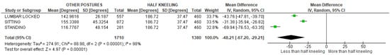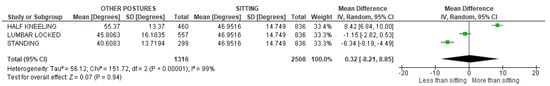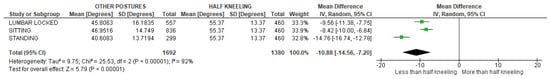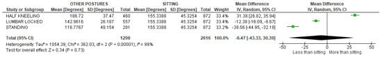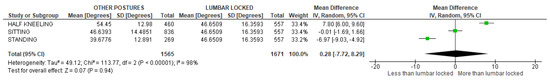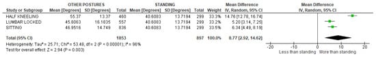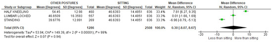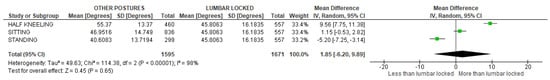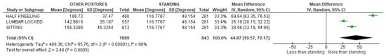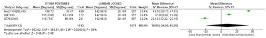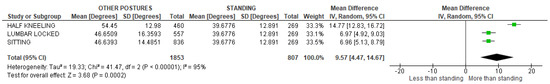 Three different types of postures were collected in the measurements: standing (32 measures), sitting (18 measures), and lumbar locked rotation test (10 measures). The devices that made the most measurements while standing (12) were electromechanical devices and three-dimensional optical motion analysis. The device that made the most measurement while sitting and in the lumbar locked rotation test (5) was mechanical devices. All the measurements postures and the devices used are present in Table 6.