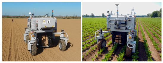 Some of the most representative autonomous agricultural robotic systems are: The robotic system for weed control in sugar beets developed by Astrand et al. (2002) [77]. The robot consisted of two vision systems used for crop guidance and detection, and a hoe for weed removal. A front camera with two-row detection at 5-meter range and near-infrared filter was used for row detection and navigation, while a second color camera mounted inside the robot was used for weed detection. Initial trials showed that color-based plant detection was feasible and that the robot’s subsystems could functionally work together. The BoniRob autonomous multipurpose robotic platform (see Figure 2) with wavelength-matched illumination system for capturing high-resolution image data was used for weed detection and precision spraying [78], and for ground intervention measurements [79]. Autonomous navigation along crop rows was achieved using 3D laser scans or by using global navigation satellite systems (GNSS). Lamm et al. (2002) developed a robotic system for weed control in cotton fields that is able to distinguish weeds from cotton plants and precisely apply herbicides. A machine vision algorithm was used to determine the diameter of the inscribed leaf circle to identify the plant species. Field tests showed a spray efficiency of 88.8 percent [80].