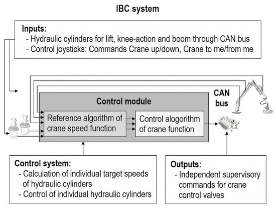 Operating with forestry cranes requires a lot of knowledge and experience to be productive with a low impact on the environment. Furthermore, trained forestry machine operators are essential for efficient timber production, in particular to reduce harvesting damage to the remaining trees and reduce machine downtime. Ovaskainen et al. (2004) [108] has shown that the productivity of trained harvester (Cut-to-length (CTL)) operators varies by about 40% under similar forest stand conditions. The study hypothesizes that efficiency differences are related to aspects of operator crane experience based on deliberate practice of motor skills, situational awareness, and visual perception. The state-of-the-art in crane control is the use of two analog joysticks, which are controlled by the two hands and/or the fingers. The joysticks provide electrical or hydraulic signals that control the flow rate of the hydraulic system and thus enable precise movement of the individual hydraulic cylinders. Motor learning is the key to smooth crane movements and harvester head control. Forest machinery machinists make approximately 4000 control inputs/h, many of which are repeated again and again but always have to be applied in a targeted manner [109]. Purfürst (2010) [110] found that learning to operate a harvester took on average 9 months. Furthermore, the operator must also master decision making and planning in order to achieve an appropriate level of performance. In summary, it can be stated that harvester/forwarder operation, especially crane operation, is ergonomically, motorically, and cognitively very demanding. To improve this, existing forestry machines are constantly being improved. Modern sensors (e.g., diameter and length measurement) combined with intelligent data processing can help to assist certain operations, such as processing stems into logs by automatically moving the harvester head to predetermined positions depending on the stem shape and log quality. On the one hand, this reduces the workload of the harvester operator, and on the other hand, optimizes the profit on the timber. Other good examples of how intelligent assistance can make work easier and also more efficient for the machine operator are the intelligent crane control systems from John Deere Forestry Oy (IBC: Intelligent Boom Control [111], see Figure 4), Komatsu (Smart Crane [112]), and Palfinger (Smart Control [113]). In such systems, the crane is controlled via the crane tip (harvester head or grapple), and the crane’s movement is automatically done via algorithms. Therefore, the operator is not controlling individual rams, but only needs to concentrate on the crane tip and control it with the joysticks. The system also dampens the movements of the cylinders and stops jerky load thrusts in the end positions, which enables jerk-free operation. The smart control results in less fatigue for the machinist, making them more productive overall. Results from Manner et al. (2019) [114] showed that if the crane is controlled with IBC compared to conventional crane control, the machine working time for the forwarder is 5.2% shorter during loading and 7.9% shorter during unloading. It has already been shown that the use of such a smart crane control system makes it much easier to learn how to operate harvester or forwarder machines [88,115].