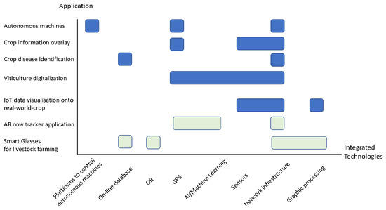 Analysis of technologies coupled with AR in Farming. Dark blue refers to crop-bases articles, whereas light green is for livestock, adapted. For details, please refer to the original paper by Hurst et al. (2021) [117].