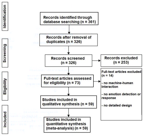 The remaining 326 articles were filtered based on title and abstracts, and 253 articles were excluded, thus, leaving 73 full-text articles to be assessed for eligibility. As a first step, each article reporting an empathic system or analysing emotions was considered eligible. (Figure 2).