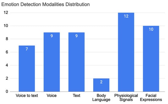 Looking for more details, we present in Figure 6 the distribution of the articles for the detection factor in each of the modalities. This distribution shows the number of articles that used a certain detection modality. The detection modalities are presented in Section 3 and are defined as voice-to-text, voice, text, body language, physiological signals, and facial expressions. There has been more interest in physiological signals, voice, text, and facial expressions. Body language was the least taken into account for emotion detection factors.