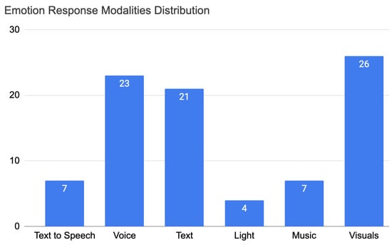 The same analysis was made on the distribution of the articles on the response modalities, and this is shown in Figure 7. This distribution shows the number of articles that are using a certain response modality. The response modalities researched were text-to-speech, voice, text, light, music, and visuals. From this analysis, we notice that visuals had the highest number of articles—26. Visuals vary from upper body movements and gestures [53] and lip syncing with facial expression [54] to a 2D game application [55,56] and abstract and numerical data visualisation [57]. Voice and text were used in 23 and 21 articles, respectively.