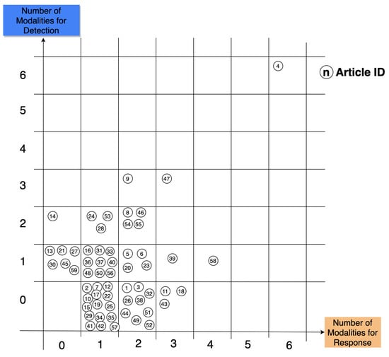 Figure 4 is an overview of the articles analysed in this systematic review, showing the percentage of work conducted on the detection modalities and response modalities. The articles analysed show that 55% of the researchers worked on the detection factor. On the other hand, we can see that 88% of the researchers worked on the response factor. We can conclude that the work was concentrated on the response modality.