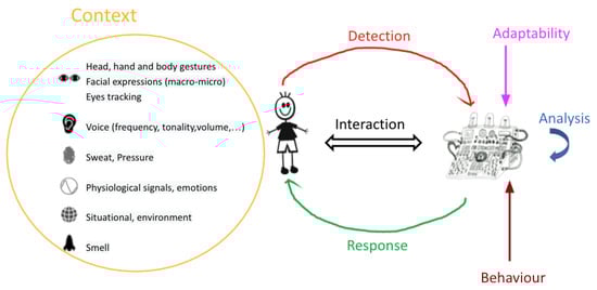In the case where the interaction is between a human and a machine, the detection and response interaction modality needs to be adapted depending on the context just as with humans. For a more comprehensive interaction, the machine should use different detection algorithms and different response modalities, where, as with humans, these response modalities need to be adapted to the context of the situation as well. For example, a machine making loud noises at midnight would not be the most suitable response at that moment when a small text would be enough, unless, for example, it is an emergency. Thus, having multiple modalities adapted to different situations is a significant challenge.