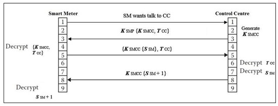 The authentication and session key discovery portion of secure two-way communication work is presented in Figure 3. Every message, m, will be authenticated and encrypted with key K. Now, every smart meter transmits m to the control center. This m is a trusted communication, which requests a session key for its communication with the control center. A control center generates a , which includes a smart meter’s public key and a ticket generated by the control center to secure the communication between them . Upon receiving the , a smart meter immediately decrypts it. Another message, , is sent by the smart meter to the control center, which is a key session between them. This message contains and random secret number . When the message is received, the control center decrypts both and ; then, it sends the message back to the smart meter as + 1, which is a value of that message encrypted between them in order to protect the two-way communication.
