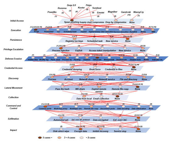 Each layer, in Figure 4, depicts the steps of a cyber attack in MITRE ATT&CK. The flow of an attack is determined by the layer order. The red line demonstrates a link between a malicious code technique and the previous approaches used. The color of the blue plane indicates the cyber attack strategies at each level. Furthermore, the circle’s hue shows the number of cyber attacks that have used it. For example, if there are five or more cyber attack kinds, the circle is dark brown; if there are three or four, it is orange; and if there are two or fewer, it is apricot [8,22,23].