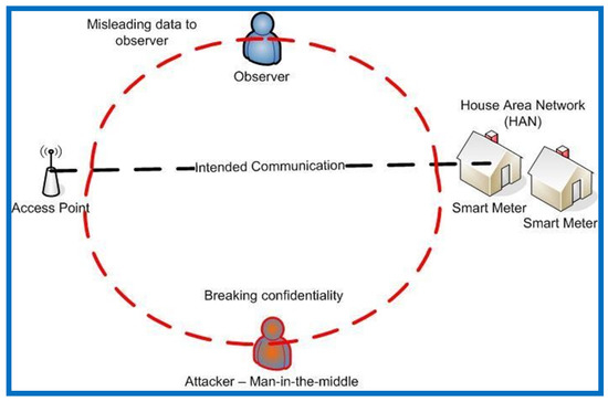 As seen in Figure 5, an MITM attack is characterized as follows: suppose entity “A” wants to monitor the messages sent by entity “B” as a smart meter to entity “C” as the control center server. A man-in-the-middle attack using keys can be conducted in this case to intercept messages between entities “B” and “C”. Thereafter, the interceptor can replace the message and deceive entity “A”. Entity “A” can be a mobile node observing data between a smart meter and a capturing device in the context of grid computing. Eavesdropping, replay attacks, and physical jamming attacks can all be treated in the same way as man-in-the-middle attacks. Consequently, Figure 6 shows how a man-in-the-middle attack can be detected and messages intercepted across the smart city communication network.