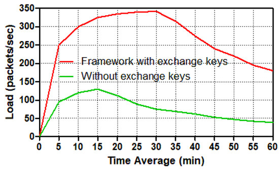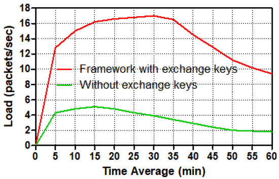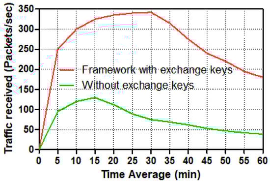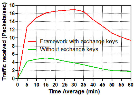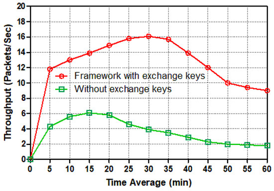 Meanwhile, just before 20 mins, the number of packets received in the un-trusted communication situation increased to 6 packets per second. After 20 mins, the amount of traffic received in packets per second rapidly decreased until it reached only 2 packets per second. The control center, on the other hand, has received traffic from 20 smart meters, but according to the smart grid communication system’s design, the smart meter can only accept traffic from the control center server. Because it deals with twenty smart meters, the control center has received significantly more traffic packets per second in both scenarios, especially in the scenario with authentication and session key exchange schemes, which required a secure two-way communication channel from each smart meter to the control center. In this situation, the control center receives many more packets per second than in the other scenario, which does not use authentication or key exchange systems.