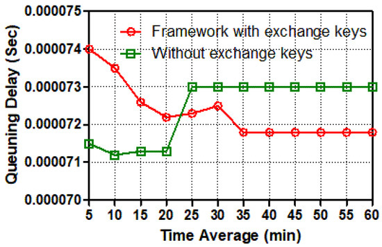 Figure 8 shows that the best effort between secure and insecure two-way communication was started with a significant point of queuing delay by 0.77 s and 0.69 s, respectively. Both graphs illustrate that the number of seconds has fluctuated significantly after five mins of simulation time. After 10 mins, the seconds of queuing delay in trusted communication are expected to decrease continuously, whereas the seconds of queuing delay in un-trusted communication are expected to grow significantly. Both graphs converge significantly between 15 and 19 mins of simulation time. After that, the un-trusted traffic line (green) stayed in a steady state for about 0.73 seconds, which was almost 0.2 seconds longer than the trusted traffic line of queuing delay until the simulation period was up. To summarize, secure communication traffic between a smart meter and a switch has more service requests and key session establishment than un-secure communication traffic. When services are requested and key sessions are established, the queuing latency in trusted communication appears to be less than in un-trusted communication from a smart meter to the switch.