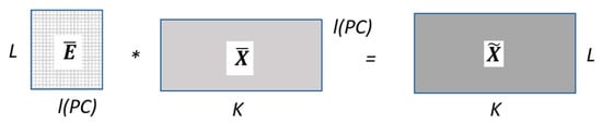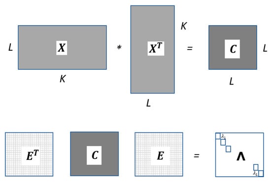 Operating with and matrices, the diagonal (eigenvalues) Λ matrix is obtained as shown in Figure 2. A particular combination of a certain number ( or principal components) of these eigenvectors, determines an -dimensional subspace in . The L-dimensional data is then projected onto this -dimensional subspace to obtain the submatrix (sized ) that allows to reconstruct the Hankel matrix , as symbolically described in Figure 3. The is considered as an approximation to , where the parameters and (Principal Components—PC) are chosen by the designer for a specific application.