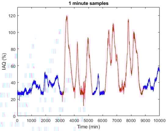 In this context, Figure 4 shows an actual record obtained at the Alcorcón Fire Department (Madrid). The test was carried out between 27 October and 3 November 2020; recording IAQ values provided by a BME680 sensor with a 1 min sampling. Over some time intervals, smoke was introduced to force a degradation of the air quality. As can be seen, between minute 3000 and 8800 there are intervals with very bad IAQ levels (see Table 1). The records in blue show results obtained under normal condition and the data in red those obtained under forced disturbance condition.