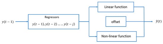 In this work we have used a solution in which the linear component responds to an autoregressive AR model; for the non-linear component we have compared three solutions: a sigmoidal function, another based on the wavelet transform and another based on the treepartition technique. Matlab has specific functions for each (sigmoidnet, wavenet and treepartition) [24,25,26]. The main configuration parameters are the number of regressors (order) and the number of non-linear functions (units), which can be chosen by the user or set automatically.