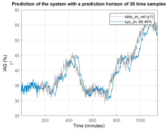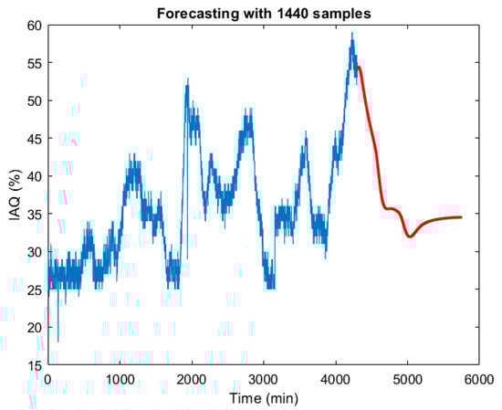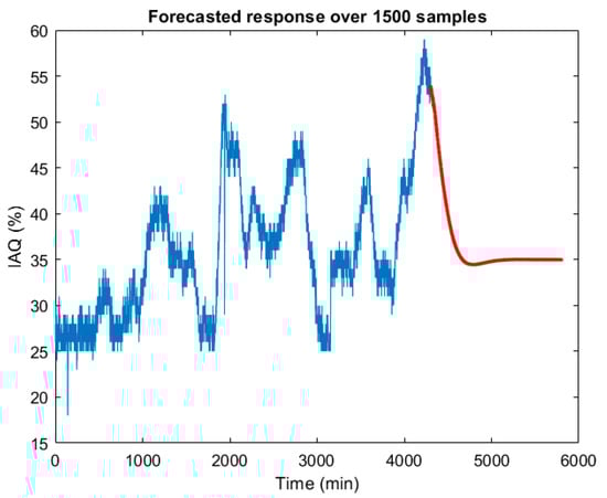 One of the objectives of time series modelling is to predict the variable under study beyond the last recorded sample. For this purpose, the Matlab forecast function [25,26] was used in this work. Figure 7 shows the IAQ prediction results for half an hour after the last recorded data.