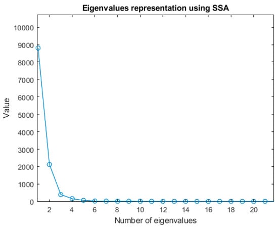 In the following, the SSA contribution to air quality modelling and prediction is evaluated. Taking as reference the works of [17,28], a time window L ≈ N/12 (250 samples) was chosen, where N is the total of the recorded data for the analysis in the time interval without forced disturbance. The covariance matrix was calculated and the eigenvalues shown in Figure 8 were obtained. The signal reconstruction obtained with L = 250 and the dominant eigenvalues (RCs = 4) is shown in Figure 9; the percentage of fit is 80.27%. As indicated in Table 3, increasing the number of principal components (eigenvalues) does not significantly improve the reconstruction percentage of the time series.