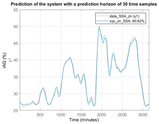 Using the same nonlinear model structure (treepartition, 50 order and 31 units), but with the SSA processed data, the model validation results are: Fit = 99.12%, MSE = 0.0035 and computation time 0.71 s. Figure 10 shows the graphical modelling results. Compared to the modelling results in Table 2, obtained using the raw data (original signal), the MSE was divided by 433, the Fit was improved by 16.88% and the computation time was reduced by 51%. The same model is applicable to the prediction of IAQ evolution. Figure 11 shows the one-day prediction (1440 samples, with a period of one minute). Compared to the prediction in Figure 6, the one obtained from the SSA processed signal shows a smoother dynamic.