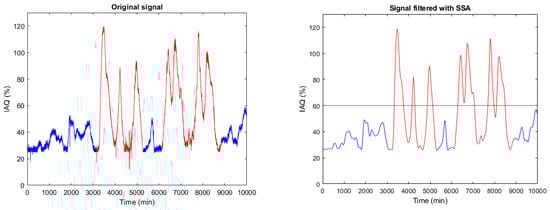 Original (left) and SSA processed (right) IAQ signal. The blue line belongs to registered data in normal conditions, while the red line is related to forced disturbances in the scenario under test. According to Table 1, 60% is the threshold to consider very bad air quality.