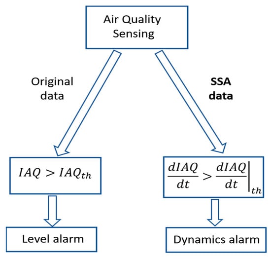Knowing the critical consequences of IAQ degradation, the authors propose a dual approach to characterise areas of anomalous behaviour: level and dynamic detection, as shown in Figure 13. A level alarm will be generated when the IAQ value exceeds the threshold = 60% (very bad IAQ according to Table 1). In the case of dynamic detection, it is unfeasible to draw conclusions from the time derivative of the original signal (raw data), as shown in Figure 14(left). However, the time derivative of the SSA processed signal (Figure 14(right)) provides relevant information about anomaly detection.