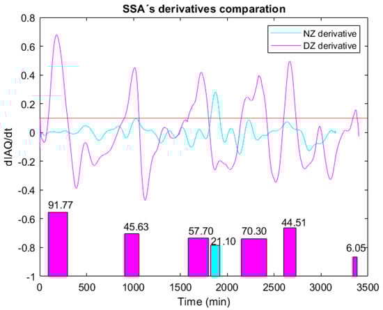 Top: Time derivative of the processed IAQ signal in both cases: without disturbance (NZ) and with disturbance (DZ). Down: Area calculated from the derivative signals with higher level to 0.1%/min; the area value is also referred.