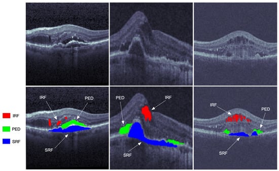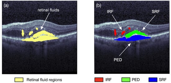 The dataset used in the work of Hu et al. [26] contained 70, 15, and 15 volumes of OCT images for training, validation, and testing purpose, respectively. A single volume was composed of 128 B-scan images with a resolution of 512 × 1024 pixels. The SRF and PED fluids were manually annotated at the pixel level by experienced ophthalmologists.