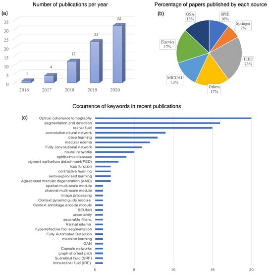 Statistics of the papers and their sources on the deep learning methods for retinal fluid segmentation published in recent years. (a) Number of publications on retinal fluid segmentation based on deep learning from 2016 to 2020. (b) Percentage of papers published by conferences and journal publishers. (c) Keywords listed in the recent publications.