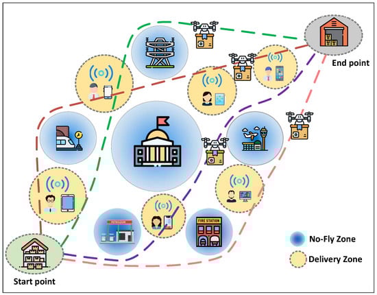 Finally, it should be noted that the drones are prohibited from crossing the NFZs when delivering packages, as illustrated in Figure 1. We assume that there exist N NFZs in the network, denoted by , and characterize the n-th NFZ as a cylindrical volume with a height greater than or equal to h [6]. We define and to be the horizontal coordinate center and radius of NFZ n, respectively. Then, to keep away from each NFZ, the following constraint should be satisfied: