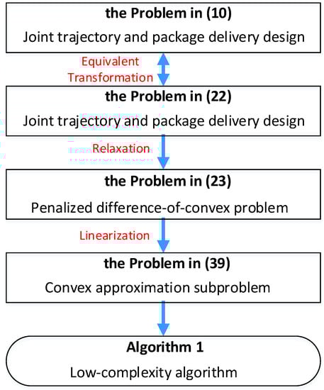 Due to the special structure mentioned above, the problem in (22) can be regarded as a difference-of-convex problem. As such, we propose a low-complexity algorithm for solving the problem in (22) based on the penalty convex–concave procedure, which generally consists of two steps, namely relaxation and linearization. The overall procedure for solving the problem in (22) is shown in Figure 2.
