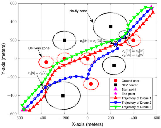 Figure 3 shows the flight trajectory of the drone fleet, where we set , , , and m. From Figure 3, some observations can be made as follows. First, we can observe that each drone in the fleet does not fly into the NFZs, demonstrating that the proposed Algorithm 1 is able to effectively avoid the NFZs. Second, from their trajectory curves, we can easily verify that there are no collisions between drones. (It is noted that although the trajectory curves of drones are overlapped at some points, they are not overlapped at the same slot. For instance, for the first cross-point of drones 1 and 2, the horizontal coordinates of the two drones are and , and for the second cross-point, the horizontal coordinates are and , where and . We can see that drones 1 and 2 actually do not meet at the same slot and thus, they will not collide.) Last, we can find that some drones (e.g., drones 1 and 3) will touch the users’ delivery zone, since they are required to perform package delivery tasks.