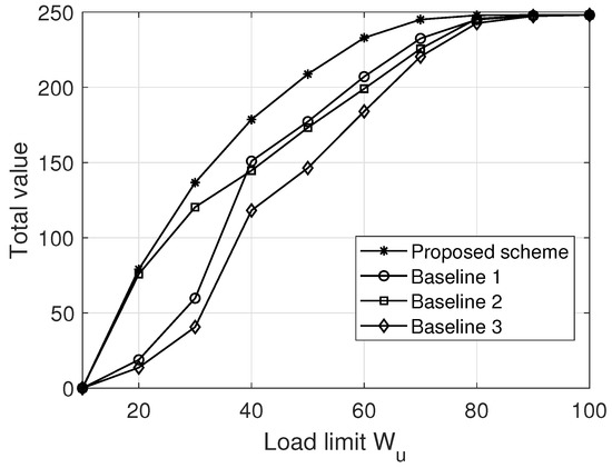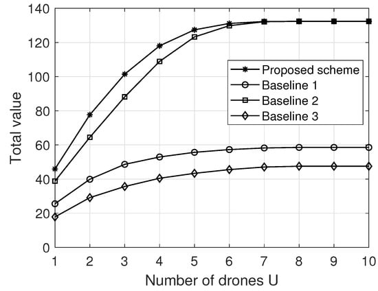 More specifically, Figure 4 and Figure 5 plot the total value versus the number of drones U and the load limit , respectively. From Figure 4 and Figure 5, it first can be seen that the performance of all schemes improves as U () increases, due to the increase in fleet carrying capacity. However, with the increase in U (), the marginal performance gain of adding more drones (storage capacity) into the fleet decreases, because the overall carrying capacity of the fleet is gradually large enough to carry all users’ packages. In addition, we also see that Baseline 2 significantly outperforms (slightly underperforms) Baseline 1 and Baseline 3 when is relatively small (large), e.g., (), indicating that the value- and distance-based schemes cannot work well in the area of each drone having a relatively small load limit. Finally, we can observe that the proposed scheme is superior to all baselines, because it can adapt well to the changes in the key system parameters through carefully optimizing the package delivery and fleet trajectory.