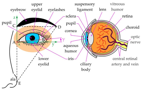 The eyes are the most important sensory organ in humans, enabling visual perception of the surrounding world—close to 80% of all impressions of the outside world are perceived by sight [93,94]. Every second, the eyes are adapting to their surroundings, the light, colors, and various other effects, absorbing information and forwarding it to the brain [95,96]. According to Refs. [97,98], the eye apparatus contains: (i) the eyeball, (ii) the visual pathways, and (iii) the auxiliary elements of the eye (see Figure 1).