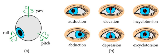 The eyeball has 3 degrees of freedom (DOFs) allowing the rotation around all three axes (see Figure 2a): around the z-axis or yaw rotation, around the y-axis or pitch rotation and around the x-axis or roll rotation. Depending on the direction of the rotation (±), there are different types of movements (see Figure 2b): adduction and abduction enable horizontal rotation of the eyeball around a vertical axis, shifting the gaze medially (toward the nose) and laterally (away from the nose), respectively; elevation and depression refer to the vertical rotation of the eyeball around a horizontal axis, shifting the gaze upward and downward, respectively; incyclotorsion and excyclotorsion allow the rotation of the eyeball around the line of sight, moving the eyeball medially and laterally, respectively.