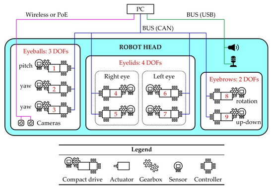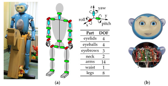 An open source humanoid robotic platform called iCub, designed explicitly to support research in embodied cognition is shown in [150]. The robot has 3 DOFs eyeballs—the cameras are located in the eyeballs, and brushed Faulhaber DC motors via toothed belts actuate them, while the eyebrows and mouth are displayed using LEDs allowing basic facial expressions; in addition, the robot has vestibular, auditory, and haptic sensory capabilities.
