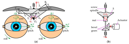 The mechanical systems of the eyeballs, eyelids, and eyebrows are the subject being reconstructed in this paper for a number of reasons: (i) the eyes and eyebrows of the robot are not capable of producing the types of motions, the ranges of motion or the speeds of their human counterparts, and having these capabilities would, on a functional level, enable the spectrum of movements necessary for the simulation of emotional expressions, which is a key feature; (ii) the existing actuators are not capable of producing speeds appropriate for human-like motion, with the output link having high values of arc backlash, which negatively impacts the positioning accuracy and the repeatability of the output link motion, especially since the cameras are located in the eyeballs; also, this problem causes jerks when movements are initiated, which negatively impacts the stability of the picture; (iii) the dimensions and shape of the actuators directly influenced the structure of the mechanical system and the mechanism dimensions—the structure is not optimized, and the dimensions are too large, making the eye modules take up most of the head’s volume (see Figure 3b); a consequence of this are potential problems during motion—unfavorable transmission angles and low mechanical advantage would cause most of the power to be wasted on overcoming internal friction in the mechanism joints; (iv) the driving mechanisms of the eyes are linkage mechanisms, but the links are imprecisely bent which caused issues with the kinematics; (v) the eye module dimensions directly impacted the structure and dimensions of the eyebrow rotation and translation mechanism; due to this, the eyebrows were positioned outside of the eye region (see Figure 3b) which is not in line with the anthropometrics of the face; in effect, the eyebrows are not functional due to the driving mechanism being inadequate because of the lack of space in the head; (v) each eyeball has 2 DOFs and due to everything stated so far, there are inconsistencies when realizing the saccades which manifests with strabismus; an additional problem is the realization of vergence movements for focusing objects in the line of sight; (vi) the base platforms of the eyes and eyebrows were made using 3D binder jetting technology and 3D printing technology, respectively; the consequences of this are manufacturing errors due to deformation during the hardening and cooling of the material, which has negative effects on the positioning accuracy and part assembly; all of this caused further problems, such as backlash in the joints and high values of friction.