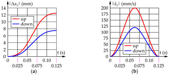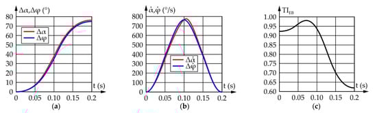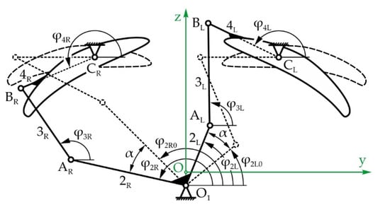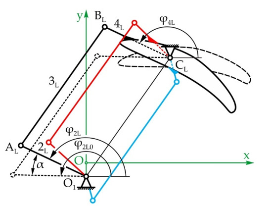 According to the input parameters of the eyeball driving system: the lever lengths and the position angles of the mechanism input links—angles α and β—the following output kinematic parameters are determined: the position—angles φ and ψ, and the angular velocities of the eyeball. Firstly, the pitch motion of the eyeball is considered, defined by the rotation angle φ: