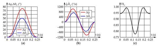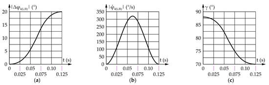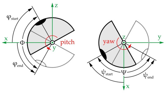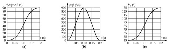 According to Ref. [109], the ranges of motion of adduction and abduction are nearly the same and equal, 44.9 ± 7.2° and 44.2 ± 6.8°, respectively, so the total yaw range of motion of the eyeball equals approximately 90°. On the other hand, the ranges of motion of elevation and depression differ and equal, 27.9 ± 7.6° and 47.1 ± 8.0°, respectively, making the total pitch range of motion approximately 75°. The smallest range of motion, if afforded to incyclotorsion and excyclotorsion, are only a few degrees each [110], which is why the roll motion of the eyeball is disregarded in this paper. The speed of the eyeball depends on the type and nature of the motion, and is determined by observing both eyes simultaneously. According to Refs. [111,112], the principal types of eye motion are: (i) saccades, (ii) smooth pursuit movements, (iii) vergence movements, and (iv) vestibulo-ocular movements. Horizontal and vertical saccades are rapid movements of the eyes between fixed points that abruptly shift the direction of the gaze—for example, reading a newspaper or scouring the objects in a room, and in this case, the angular speed of the eyeball reaches values of 400–800°/s. On the other hand, smooth pursuit movements are gentle and very slow movements of the eyes that enable the tracking of objects in motion at great distances, and in this case, the angular speed does not exceed 30°/s. Differing from these types of movement where both eyes rotate in the same direct, vergence movements rotate the eyeballs in different directions allowing them to focus on specific objects—for example, when moving a finger to and from the nose, and in this case, the angular speed reaches values of 30–150°/s. Vestibulo-ocular movements are reflexive eye movements that compensate sudden and abrupt head movements to stabilize the image seen by the eyes, and in this case, the angular speed reaches values of 800°/s.